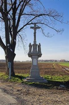 Pod křížem stojí dvě sochy v podživotní velikosti při modlitbě, s očima upřenýma ke kříži. Patrně jde o P. Marii nalevo a Maří Magdalénu napravo. V podstavci se nachází reliéf kalichu a hostie.